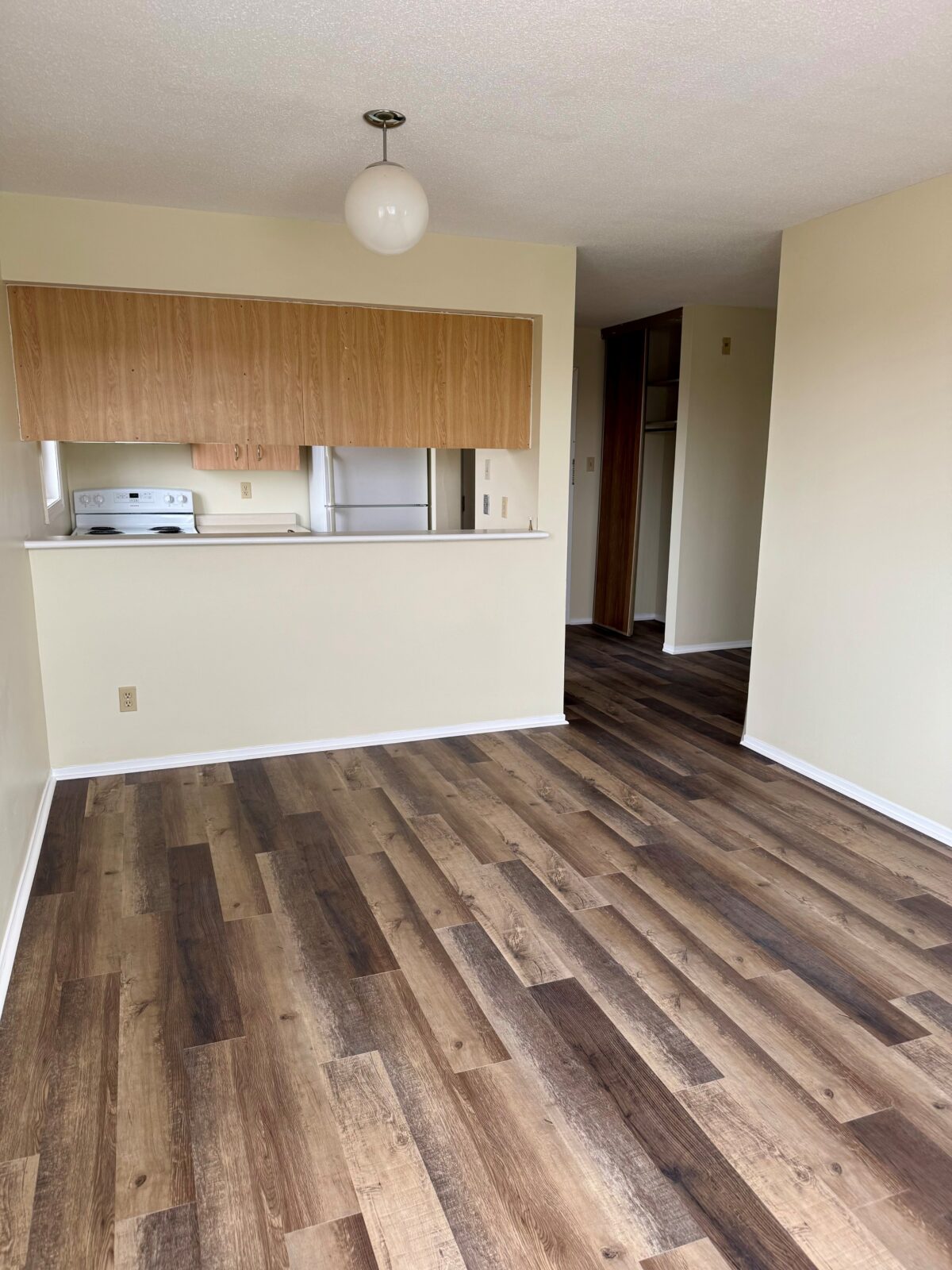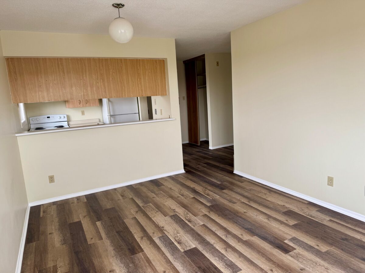 Step inside to discover new laminate flooring throughout and large windows that flood the space with natural light. The galley kitchen features ample cabinetry, counter space, convenient dishwasher and a breakfast bar perfect for entertaining. The living area provides access to a private balcony for enjoying your morning coffee or unwinding after a long day. Both bedrooms are good sized, and the primary includes a walk-in closet. Full four piece bathroom. Dedicated outdoor parking space.