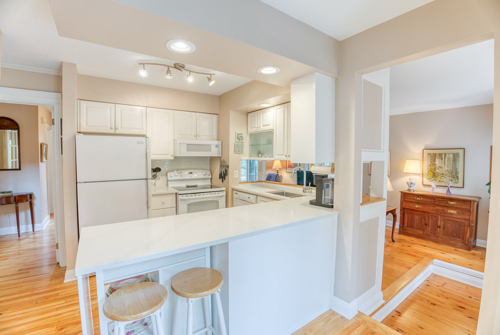 Inside, the main level features gleaming hardwood floors and a bright, functional layout. The spacious living room includes a cozy wood-burning fireplace and opens seamlessly to the dining area – perfect for entertaining. The kitchen offers a charming peek-a-boo window to the family room, adding warmth and connection when hosting. There’s also a sunny eat-in area with large windows overlooking the backyard, flooding the space with natural light. A convenient 2-piece bath completes the main level.